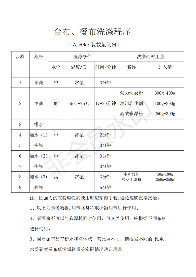 3) 分檢時(shí)最好將較臟的臺(tái)布與不太臟的臺(tái)布分開洗滌,臟臺(tái)布洗滌劑用量可多加些,不太臟的臺(tái)布洗滌劑的用量可減少些,這樣可節(jié)省用料量。