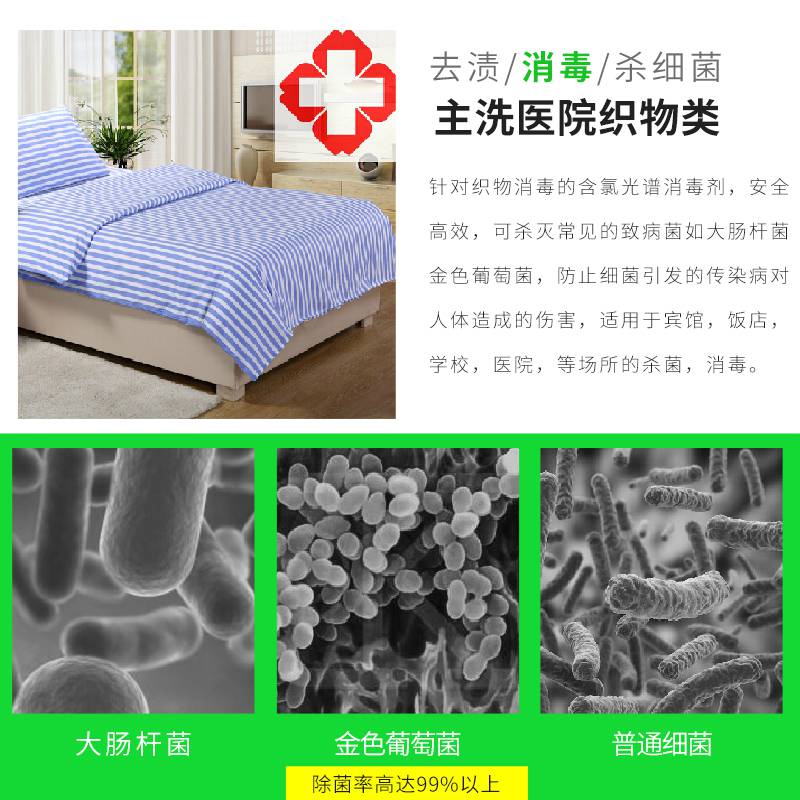 產品描述:針對織物消毒的含氯光譜消毒劑,安全高效,可殺滅常見的致病菌如大腸桿菌、金色葡萄菌、防止細菌引發的傳染病對人體造成的傷害。